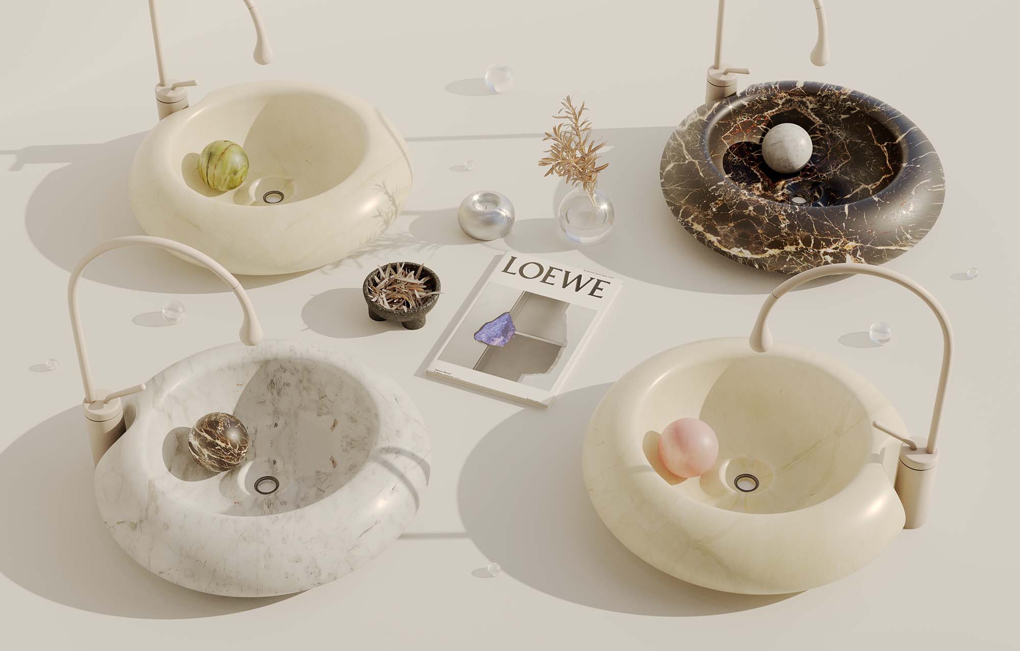 The design uses unique ball plug which sits in a sculpted groove around the bowl. As the marble ball is rolled, the basin will gradually begin to resonate a beautiful tone. Challenging perceptions marble is a cold and resolute substance, Mitchell invites the material to sing throughout the gallery. Through enchanting physical sensation, the sink refreshes not just your hands but your mood.
